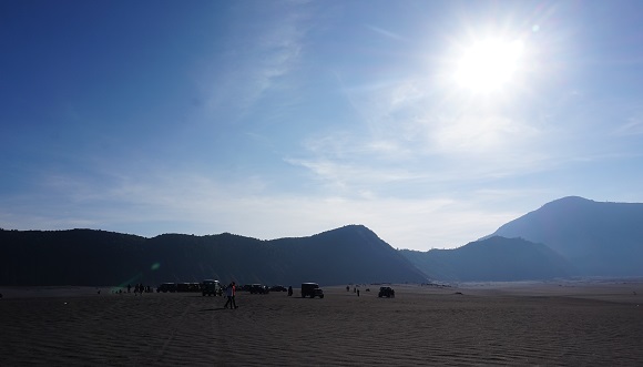 Usai matahari benar-benar terbangun dari tidurnya, kami pun bergegas kembali menuju jip dan bergerak menuju lautan pasir di kaldera Gunung Bromo.
